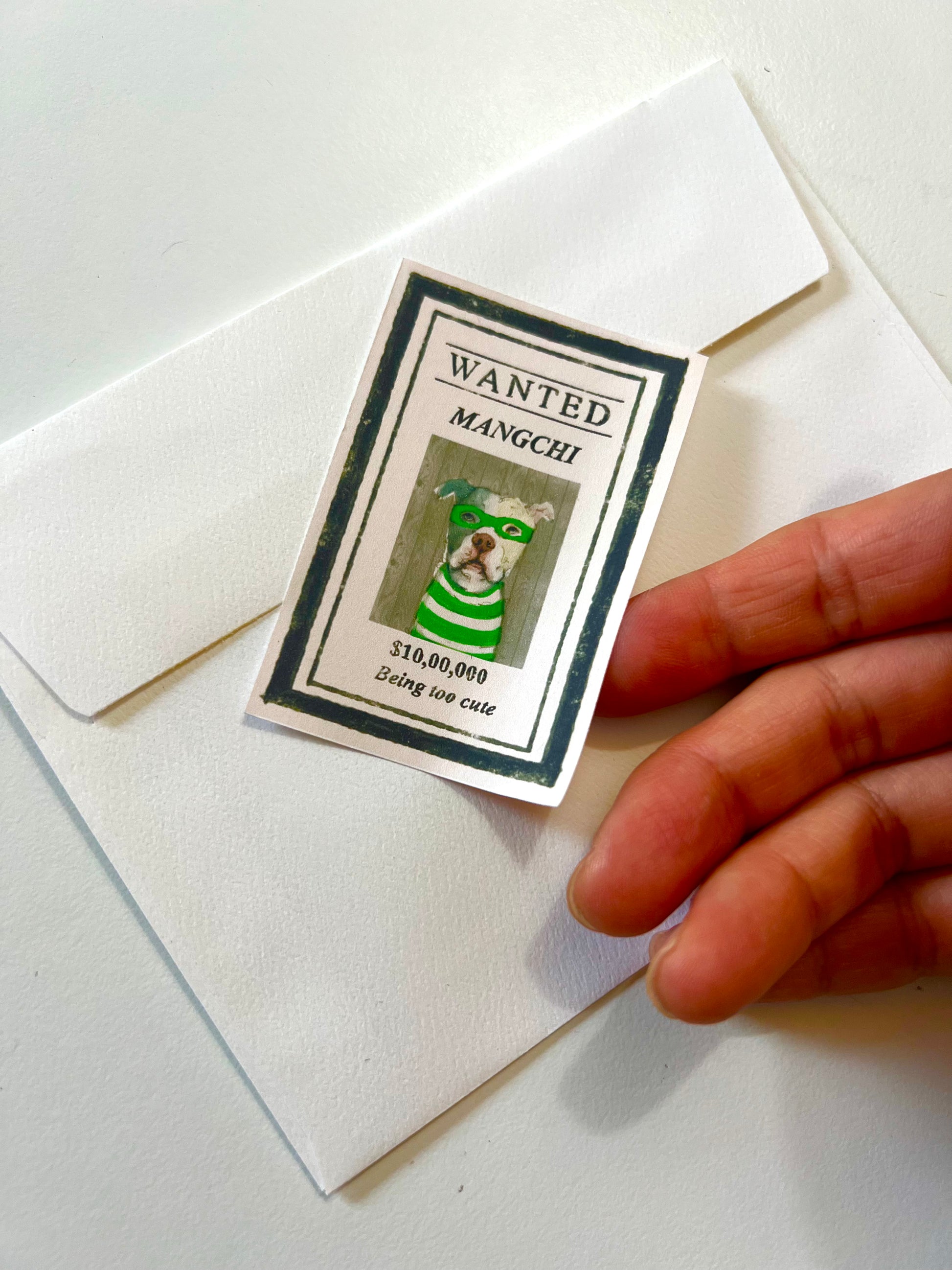 The art pack includes a 5"x7" print, two 4"x6" cards with envelopes, and a set of twelve DOG WANTED stickers. Don’t miss out.